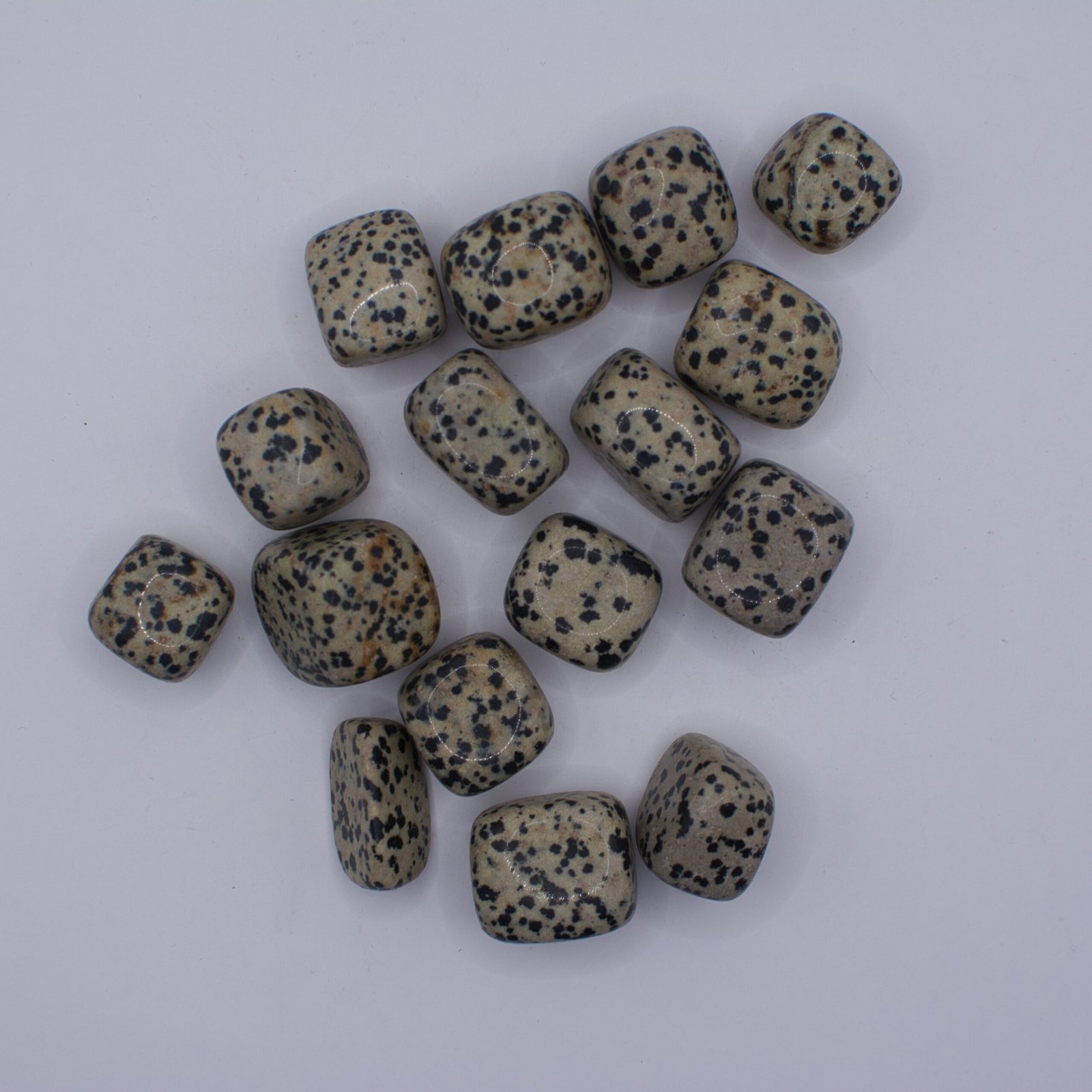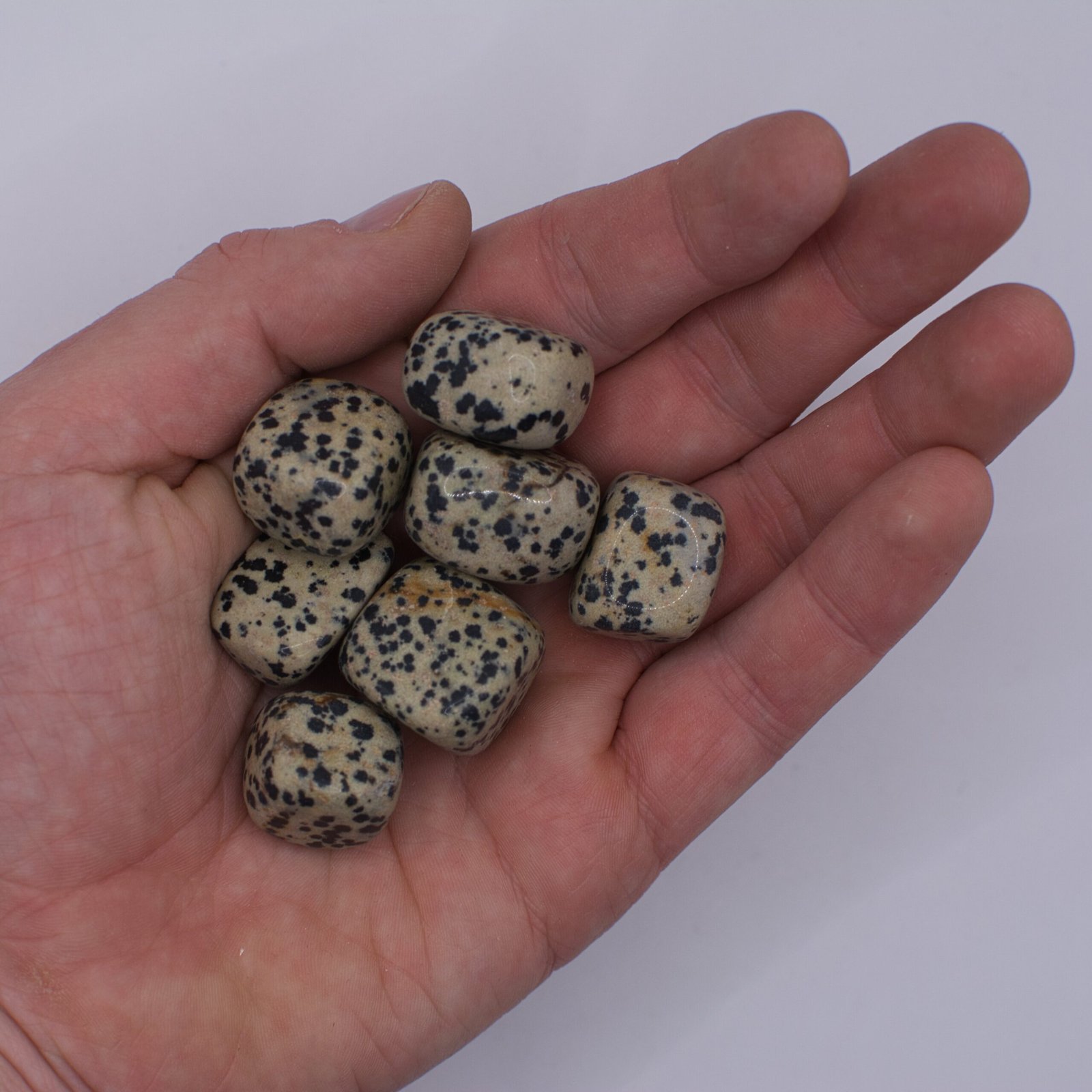 Dalmatin Jaspis är en glad och karaktärsfull sten som genast drar till sig uppmärksamhet med sitt unika, svartprickiga mönster. Dess krämiga, beigefärgade bas med distinkta svarta fläckar (som ofta består av mineraler som Svart Turmalin) påminner om en dalmatinerpäls.